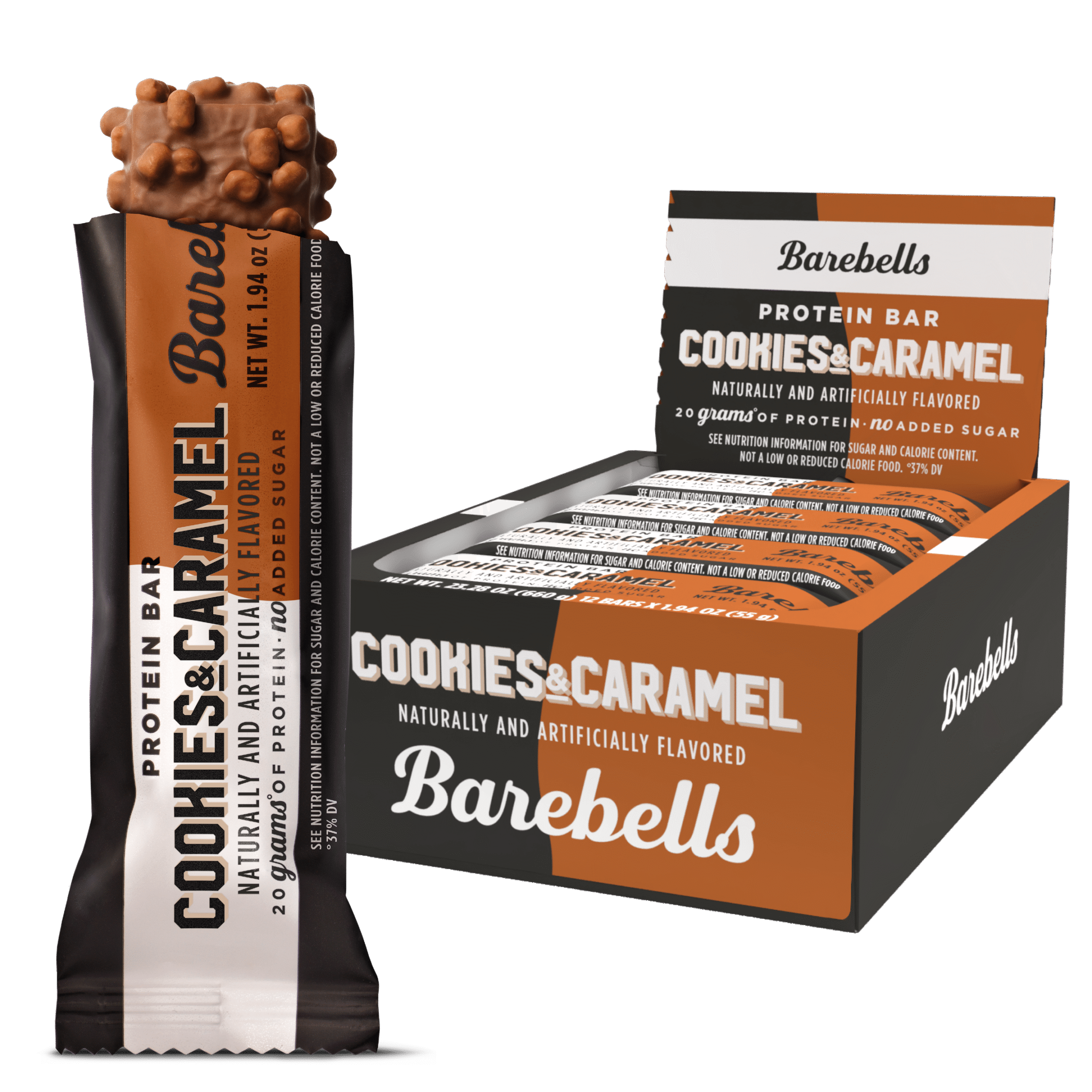 Barebells Cookies and Caramel is the perfect balance of flavor and nutrition, making staying fit so much tastier! We took our beloved fan-favorite Cookies and Cream bar to the next level, adding a layer of sweet and salty caramel. With a cookie and chocolate-flavored center, crisp toppers, and milk chocolate cover, this protein bar will make you wonder if you?re eating dessert. But with 20 grams of protein and no added sugar*, Barebells Cookies and Caramel is indeed a protein bar ? and a taste you?ll keep coming back for more!