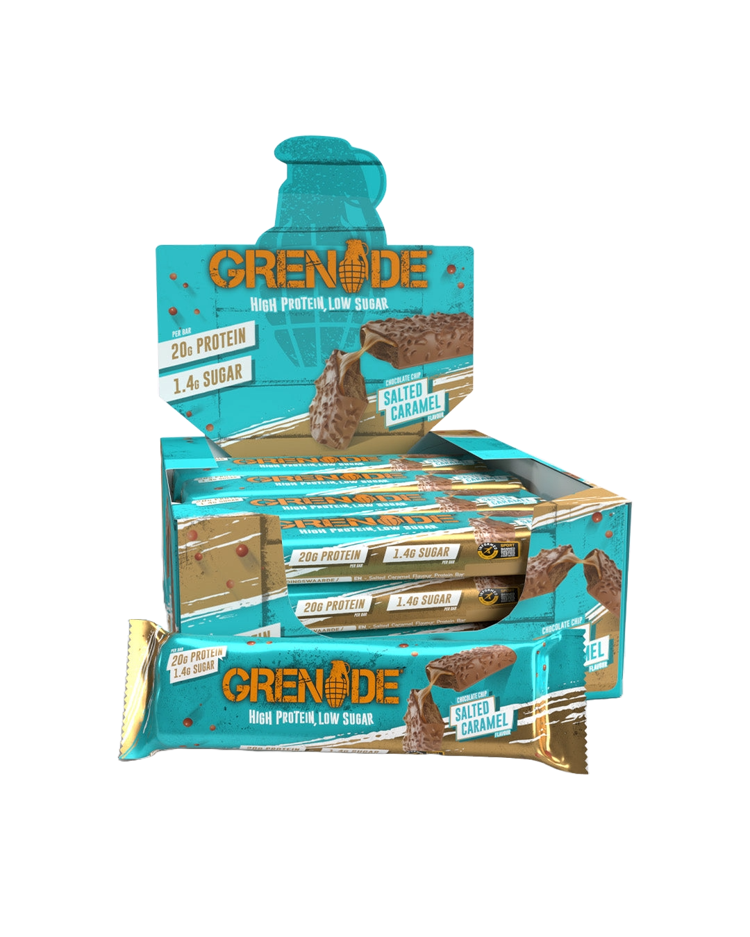 1 Box Contains 12 x (60g) Chocolate Chip Salted Caramel Protein Bars