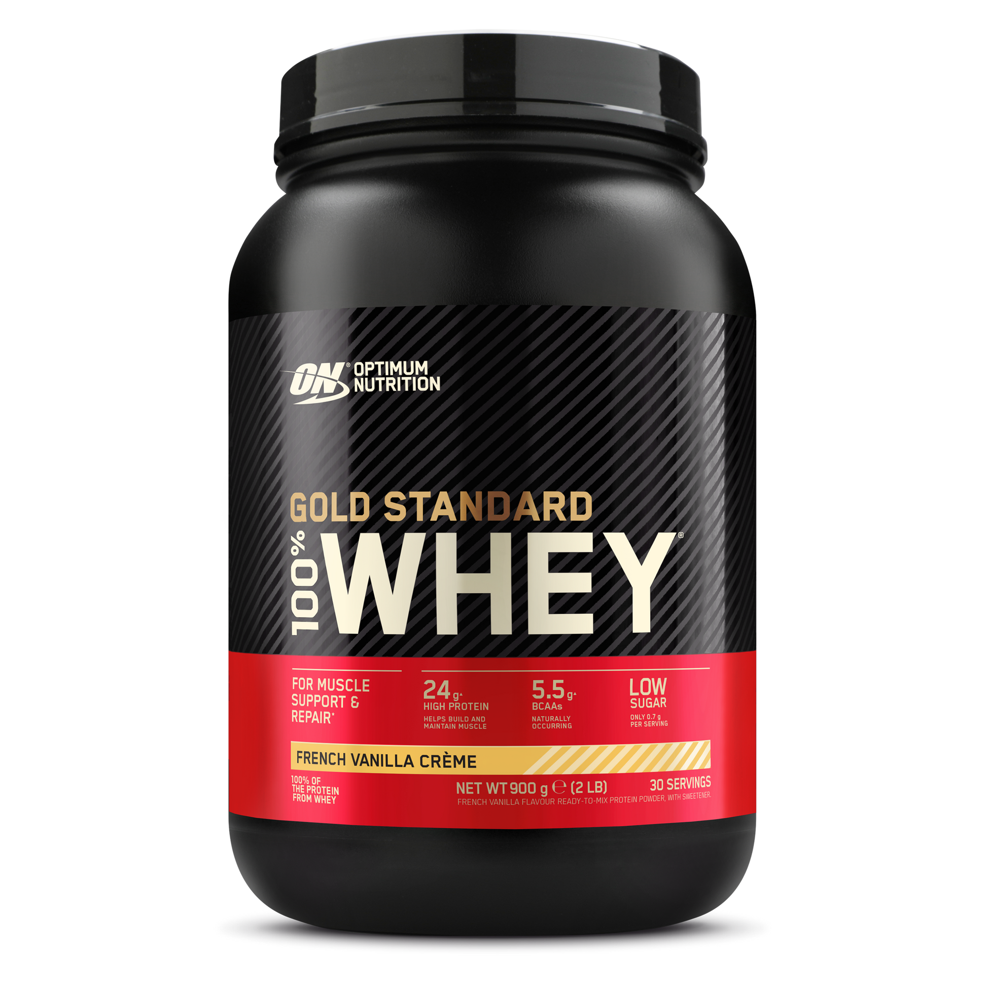 Optimum Nutrition’s GOLD STANDARD 100% WHEY PROTEIN POWDER is the world?s best-selling whey protein. It delivers 24 g of whey protein to support muscle growth. After training, your body uses protein to help repair and rebuild muscle fibres. Each great tasting serving contains 24 g of premium whey protein to support muscle growth and 5.5 g of naturally occurring BCAAs. All with just 1.4 g of fat, 0.7 g of sugars, and with 1.3 g of carbs.